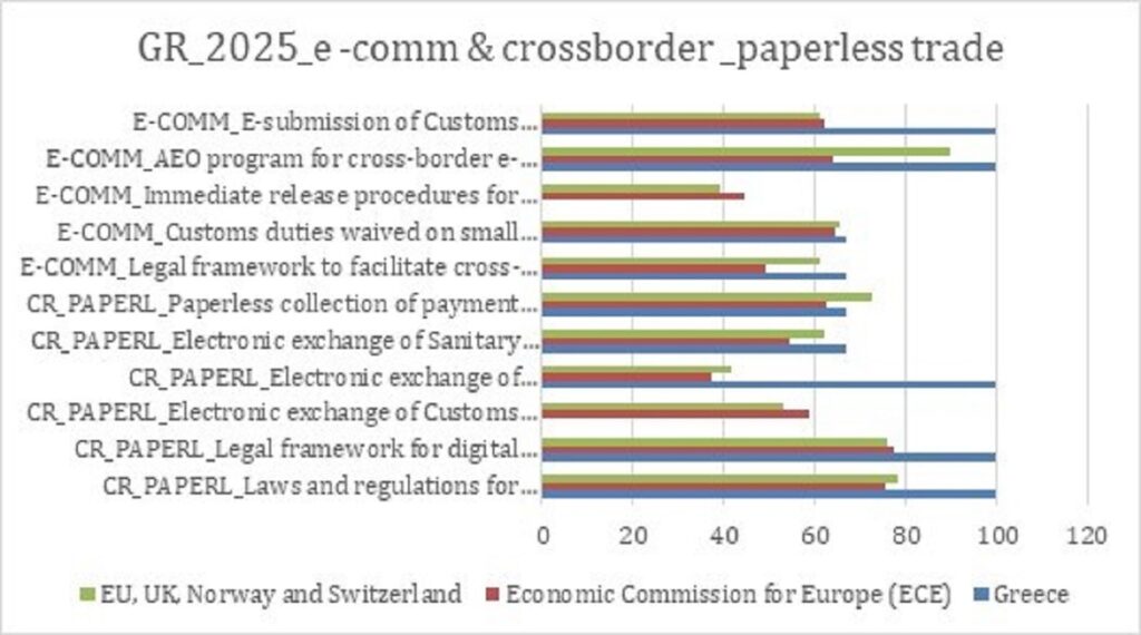 Στο Ηλεκτρονικό εμπόριο και το paperless διασυνοριακό εμπόριο, η Ελλάδα παρουσιάζει άριστες επιδόσεις στη νομοθεσία για ηλεκτρονικές συναλλαγές (100%) και την ηλεκτρονική ανταλλαγή Πιστοποιητικών Καταγωγής (100%).