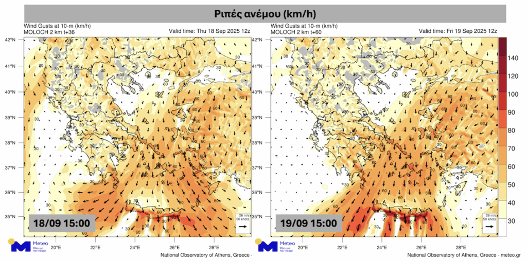 Πιο συγκεκριμένα, κατά τη διάρκεια της Πέμπτης 18/09 και της Παρασκευής 19/09, οι άνεμοι θα πνέουν με εντάσεις έως 6-7 μποφόρ και τοπικά πιθανώς έως 8 μποφόρ, ενώ οι ριπές του ανέμου αναμένεται να ξεπεράσουν κατά τόπους τα 70-80 km/h, όπως διακρίνεται και στο παρακάτω γράφημα.