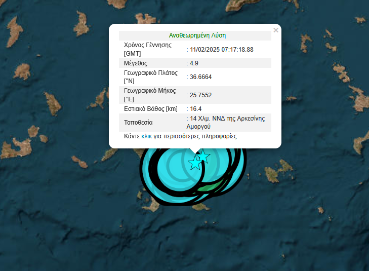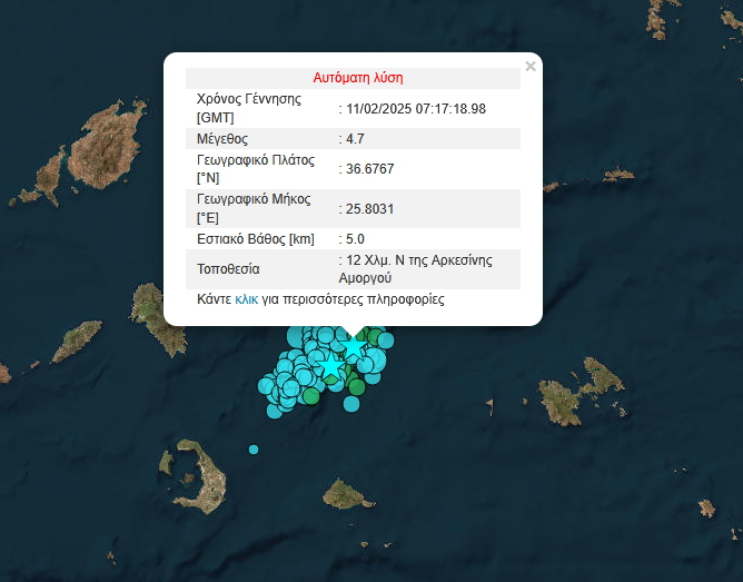 Στις 09:17 ένας ακόμα σεισμός μεγέθους 4,7 Ρίχτερ σημειώθηκε 12Χλμ Ν της Αρκεσίνης Αμοργού. Είχε εστιακό βάθος 5χλμ
