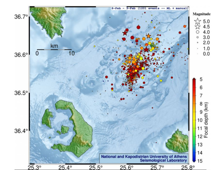 Σύμφωνα με το Εργαστήριο Σεισμολογίας του ΕΚΠΑ, από τις 26 Ιανουαρίου μέχρι και σήεμρα, σημειώθηκαν 12.800 σεισμοί ανάμεσα σε Σαντορίνη και Αμοργό. Όπως αναφέρει οι σεσμολόγοι αυτήν την στιγμή εξετάζουν τρία βασικά σενάρια: