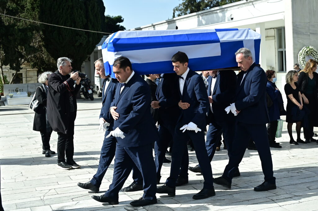 Το φέρετρο, καλυμμένο με την ελληνική σημαία, μεταφέρθηκε στον χώρο της τελετής μέσα σε χειροκροτήματα και εμφανή συγκίνηση. Παλαιοί συνεργάτες, φίλοι αλλά και απλοί πολίτες βρέθηκαν εκεί για να τιμήσουν τη μνήμη του.