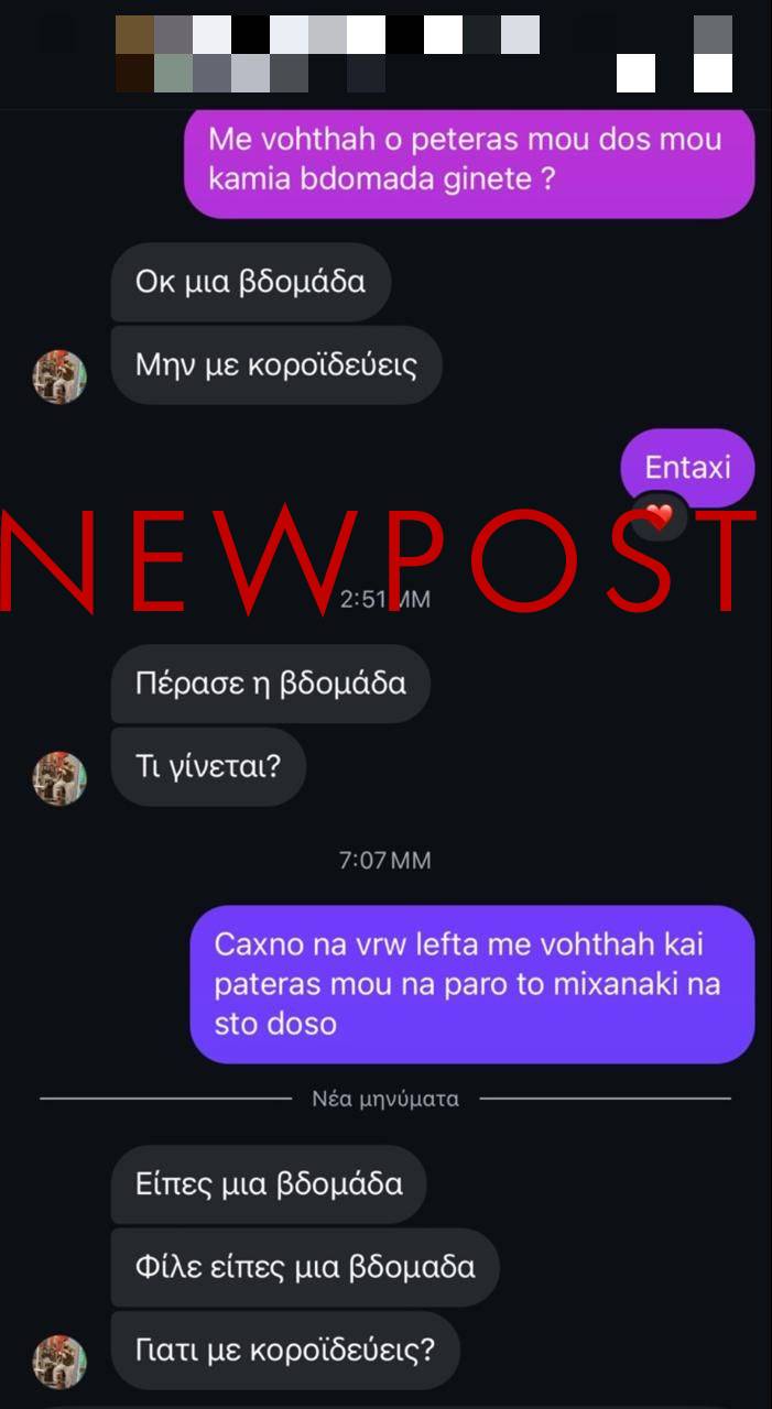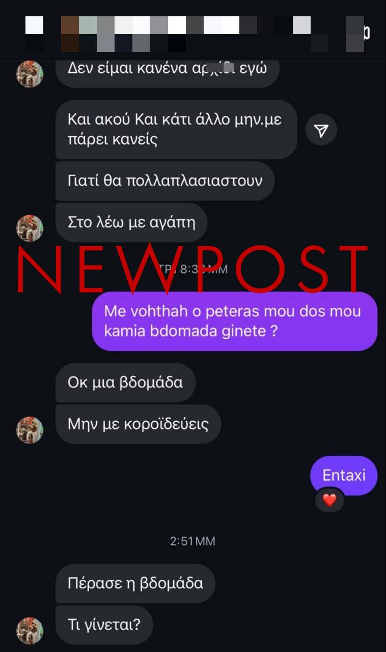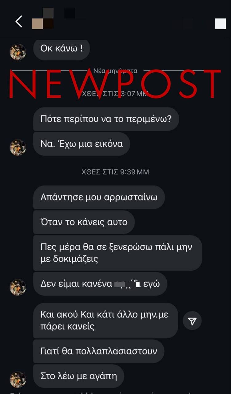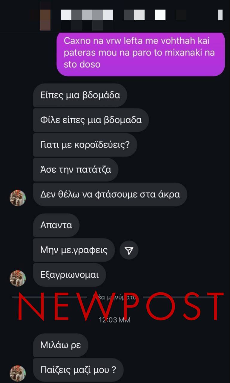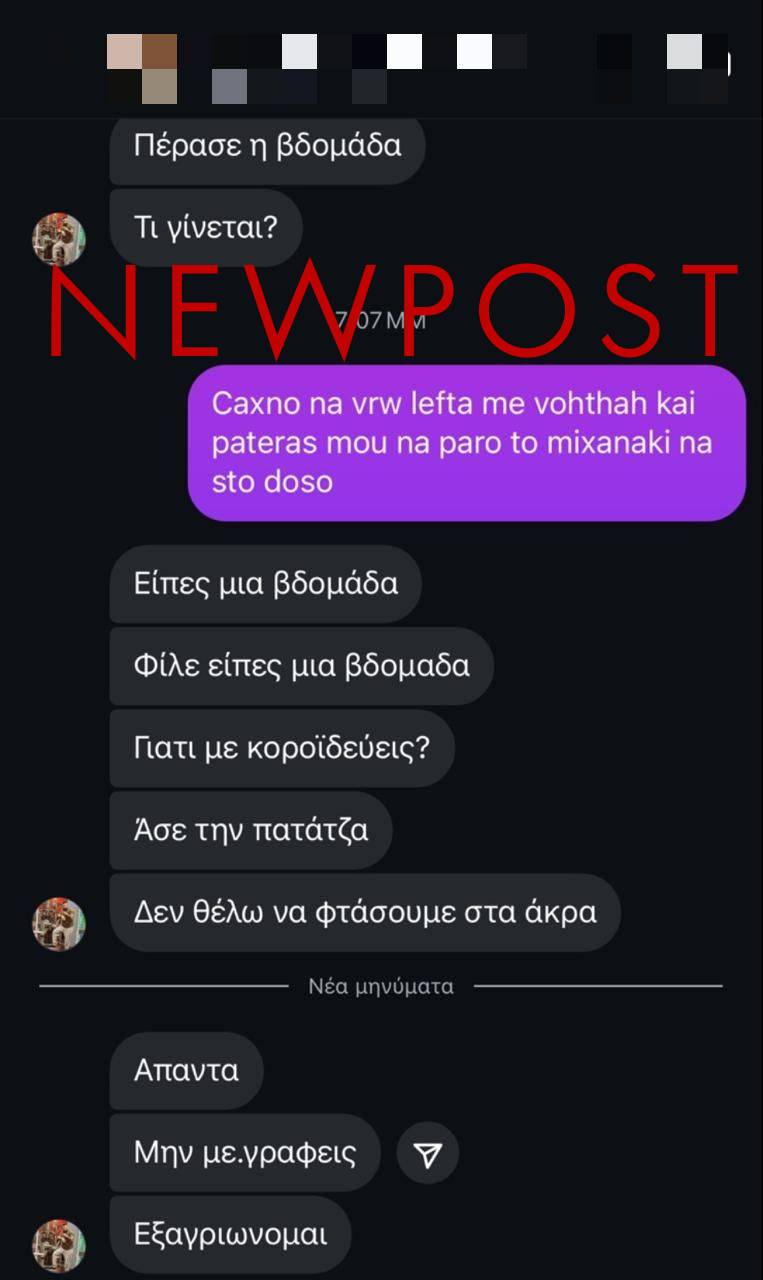 Ο ένας από τους δράστες του ζητά επίμονα «αυτά που συμφώνησαν». «Δεν θέλω να φτάσουμε στα άκρα» αναφέρει σε ένα από τα μηνύματα, ενώ σε άλλο του λέει «Μη με γράφεις, εξαγριώνομαι».
