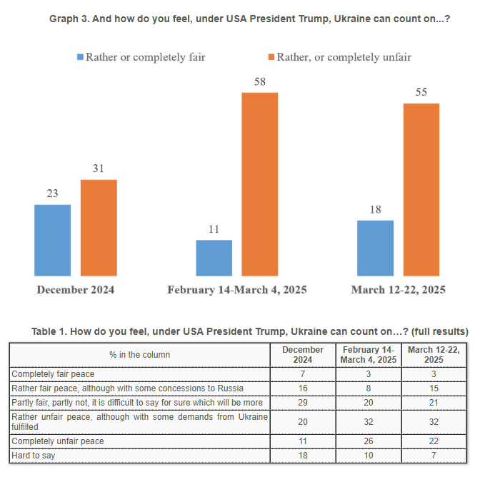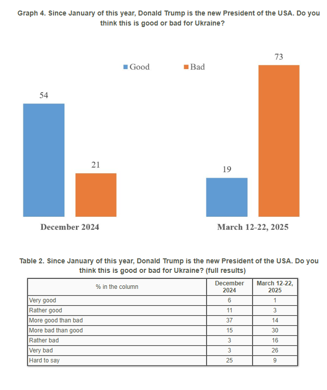 Τα στοιχεία αυτά υποδηλώνουν ότι οι Ουκρανοί είναι πλέον λιγότερο αισιόδοξοι για τις προσπάθειες του Τραμπ από τότε που ανέλαβε τα καθήκοντά του τον Ιανουάριο.