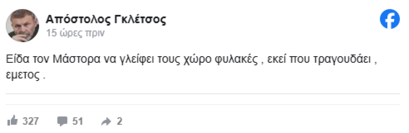 Το περιστατικό αυτό σε συνδυαμό με τις δηλώσεις του Χρήστου Μάστορα πάνω από τη σκηνή προς τους αστυνομικούς, φαίνεται πως εξόργισε τον Απόστολο Γκλέτσο, ο οποίος τοποθετήθηκε επί του θέματος με μία ανάρτηση στα social media. Πιο συγκεκριμένα, έγραψε στον προσωπικό του λογαριασμό στο Facebook: «Είδα τον Μάστορα να γλείφει τους χωροφύλακες εκεί που τραγουδάει, εμετός».