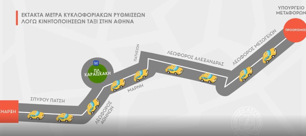 Ειδικότερα, θα υπάρξουν κυκλοφοριακές ρυθμίσεις από την οδό Σπύρου Πάτση, όπου θα συγκεντρωθούν τα ΤΑΞΙ, και στη συνέχεια διαδοχικές ρυθμίσεις κυκλοφορίας στο δρομολόγιο μέσω Λεωφόρου Αθηνών, Πλατεία Καραϊσκάκη, Μάρνη, Πατησίων, Λεωφόρου Αλεξάνδρας καθώς και στη Λεωφόρο Μεσογείων, μέχρι το Υπουργείο Υποδομών και Μεταφορών.