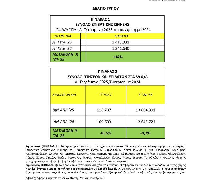 Αύξηση 9,2% προκύπτει και στην επιβατική κίνηση για το α΄ τετράμηνο του έτους 2025 στο σύνολο των αεροδρομίων της χώρας που διεξάγονται εμπορικές πτήσεις (39 αεροδρόμια: 24 ΥΠΑ, 14 FRAPORT GREECE , ΔΑΑ). Συγκεκριμένα, η επιβατική κίνηση το χρονικό διάστημα Ιανουαρίου-Απριλίου 2025 έφτασε τα 13.804.391, έναντι 12.645.721 επιβατών το αντίστοιχο χρονικό διάστημα του 2024.