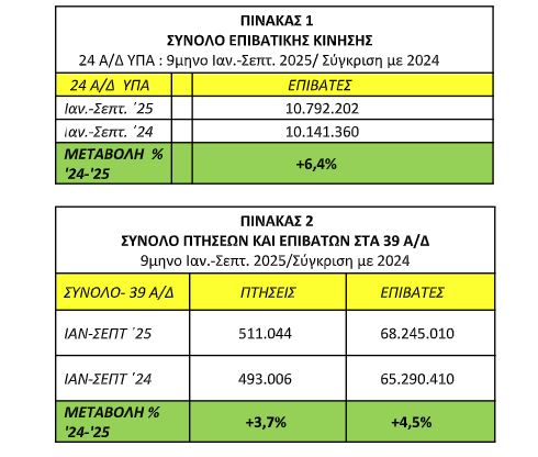 Όσον αφορά τον αριθμό κινήσεων αεροσκαφών, (αφίξεις και αναχωρήσεις αεροσκαφών εσωτερικού και εξωτερικού), για το 9μηνο Ιανουαρίου – Σεπτεμβρίου 2025, στο σύνολο των 39 αεροδρομίων της χώρας, των οποίων τον έλεγχο εναέριας κυκλοφορίας ασκεί κυρίως η ΥΠΑ, σημειώθηκε αύξηση 3,7% σε σχέση με το 2024. Ειδικότερα, συνολικά το χρονικό διάστημα Ιανουαρίου-Σεπτεμβρίου 2025 πραγματοποιήθηκαν 511.044 πτήσεις, έναντι 493.006 πτήσεων το 2024.