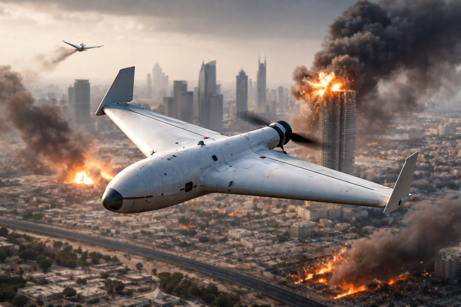 Σε ένα από αυτά, ένα ιρανικό drone κατεβαίνει με μεγάλη ταχύτητα και χτυπά εγκατάσταση ραντάρ στο αρχηγείο του Πέμπτου Στόλου των ΗΠΑ στη Μανάμα του Μπαχρέιν. Η έκρηξη εκτοξεύει συντρίμμια στον αέρα και προκαλεί την κατάρρευση της κατασκευής.