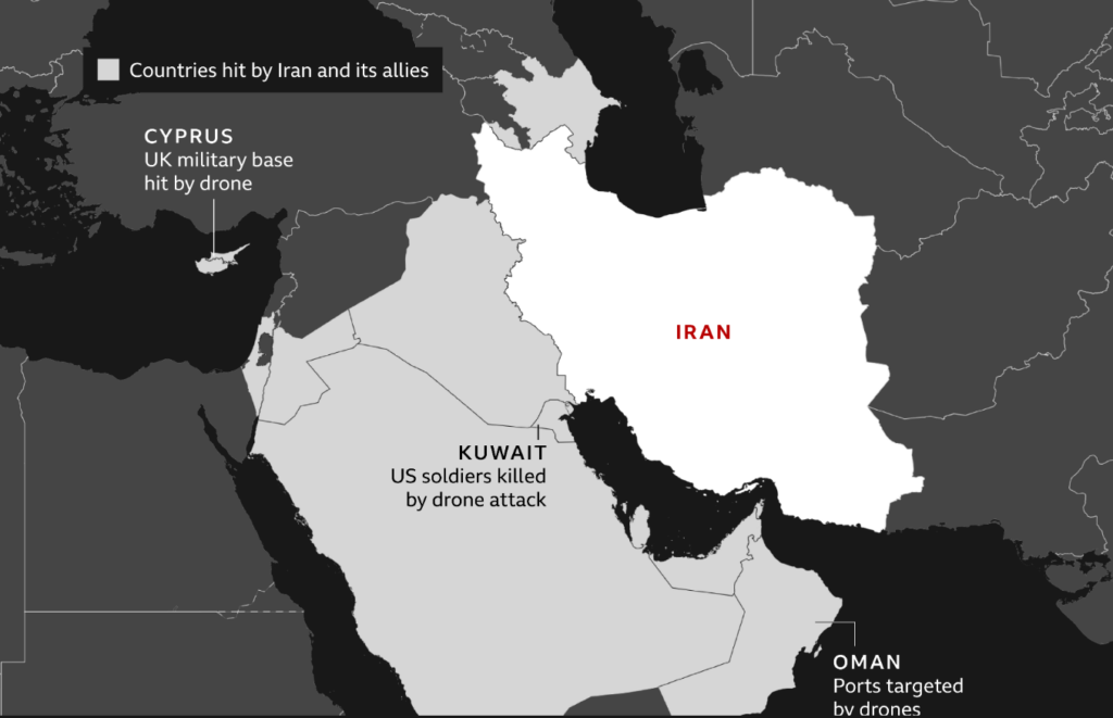 Τα ιρανικά drones έχουν πλήξει στόχους σε πολλές χώρες της περιοχής. Μεταξύ αυτών βρίσκονται το Ισραήλ, η Ιορδανία, το Ιράκ, το Κουβέιτ, η Σαουδική Αραβία, το Μπαχρέιν, το Κατάρ, τα Ηνωμένα Αραβικά Εμιράτα και το Ομάν. Ακόμη και η Κύπρος βρέθηκε στο επίκεντρο, όταν drone έπληξε βρετανική στρατιωτική εγκατάσταση.