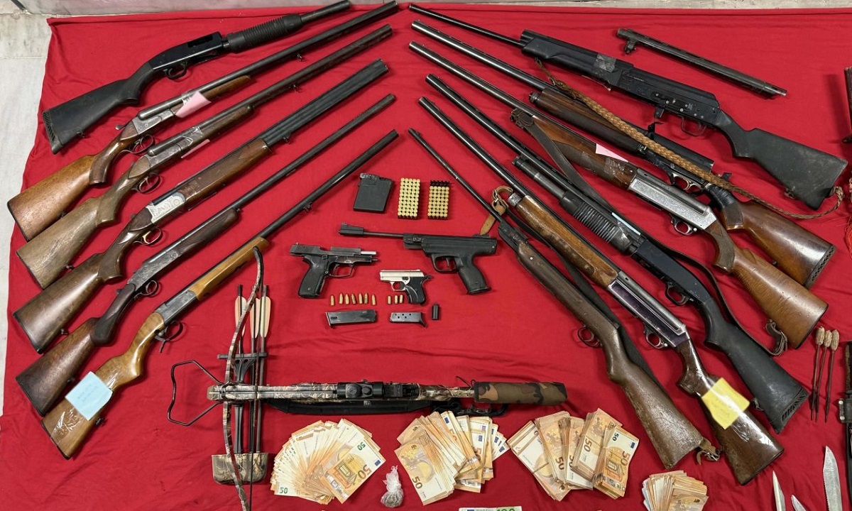 Κατασχέθηκαν πάνω από 20 πυροβόλα, σπάθες, βαλλίστρα, μαχαίρια, φυσίγγια και 83.000 ευρώ – Δικογραφία και για τον 61χρονο πατέρα