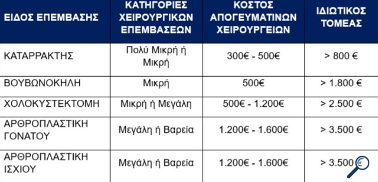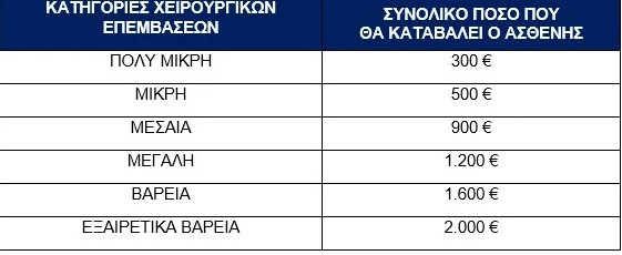 Η συμμετοχή του θα ξεκινά από 300 ευρώ για απλές επεμβάσεις και θα φτάνει έως τις 2.000 ευρώ για βαριά χειρουργεία.