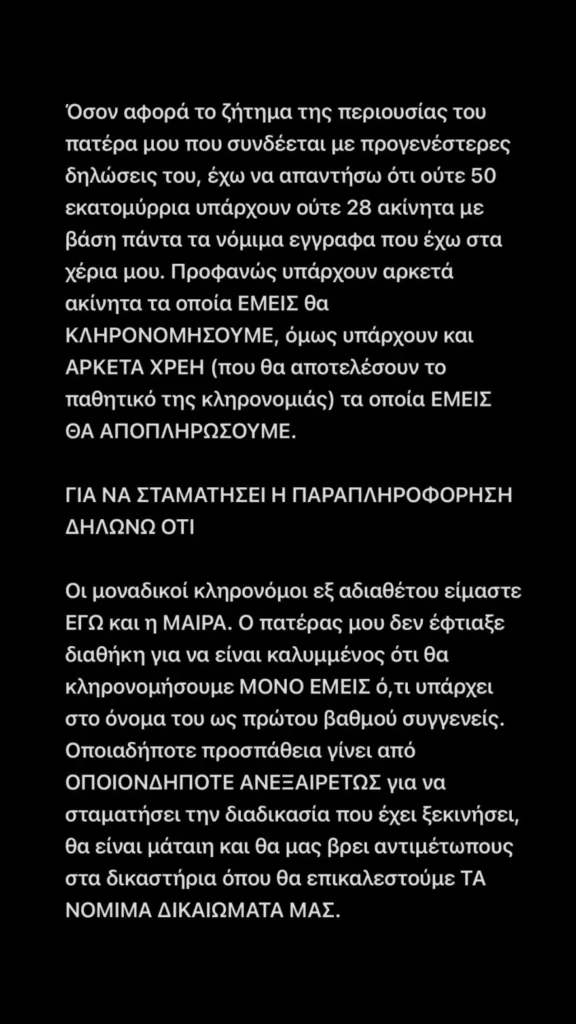 Κλείνοντας, δε, δηλώνει ότι «οι μοναδικοί κληρονόμοι εξ αδιαθέτου είμαστε εγώ και η Μάιρα (σ.σ. η αδελφή του). Ο πατέρας μου δεν έφτιαξε διαθήκη για να είναι καλυμμένος ότι θα κληρονομήσουμε μόνο εμείς ό,τι υπάρχει στο όνομά του ως πρώτου βαθμού συγγενείς. Οποιαδήποτε προσπάθεια γίνει από οποιονδήποτε ανεξαιρέτως για να σταματήσει τη διαδικασία που έχει ξεκινήσει, θα είναι μάταιη και θα μας βρει αντιμέτωπους στα δικαστήρια όπου θα επικαλεστούμε τα νόμιμα δικαιώματά μας»