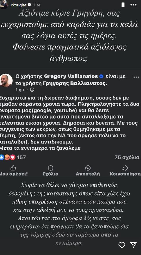 «Ευχαριστώ για τη δωρεάν διαφήμιση, όσους δεν με έμαθαν σαράντα χρόνια τώρα. Πληκτρολογήστε τα δυο ονόματά μας (google, youtube) και θα δείτε αναρτημένα βίντεο με αυτά που ανταλλάξαμε τα τελευταία είκοσι χρόνια. Δημόσια και δυνατά. Με τους συγγενείς των νεκρών, όπως θυμηθήκαμε με τα Τέμπη, (εκτός από την ΝΔ που άργησε πολύ να το καταλάβει), δεν αντιδικούμε. Μετά τα εννιάμερα τα ξαναλέμε». έγραψε στο facebook ο Βαλλιανάτος.