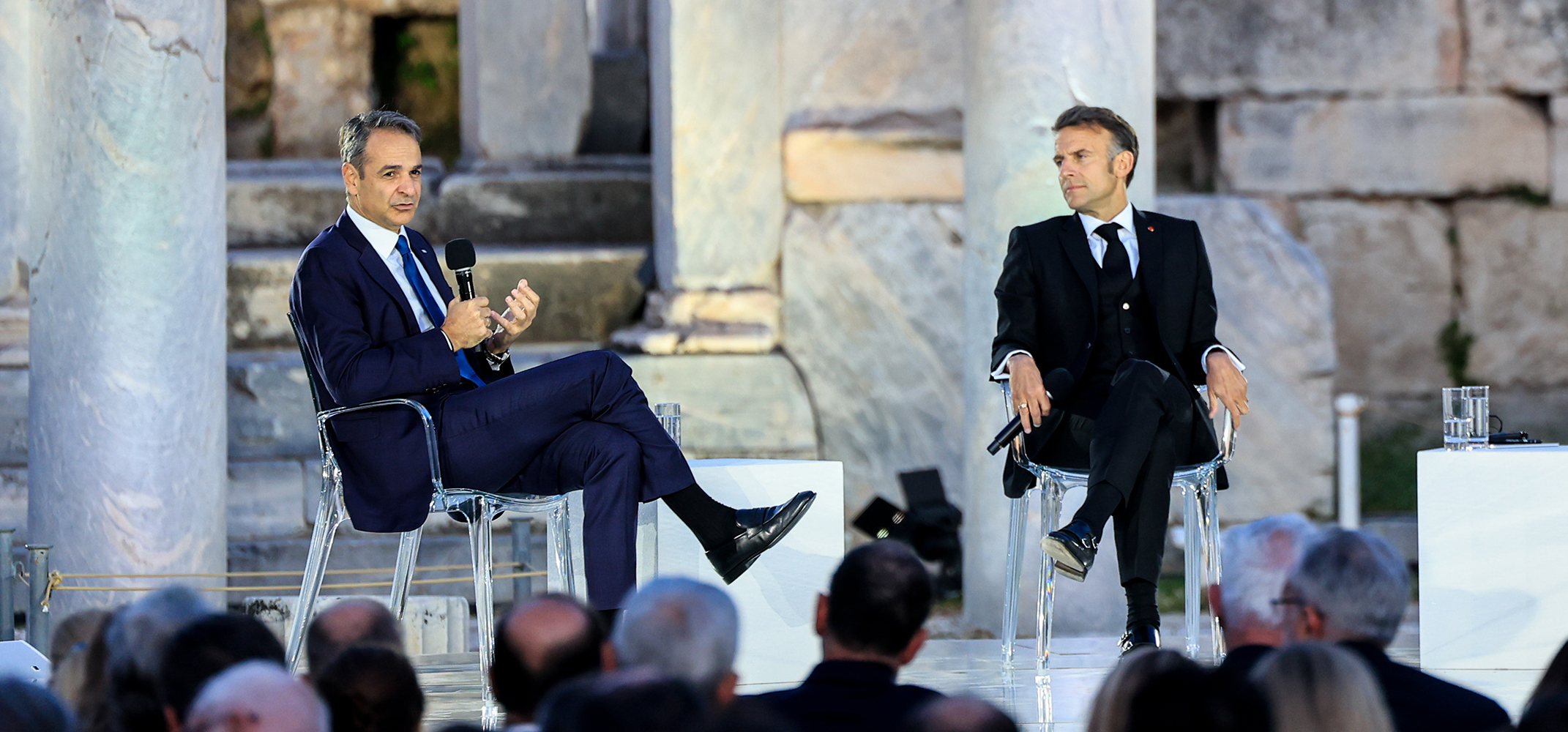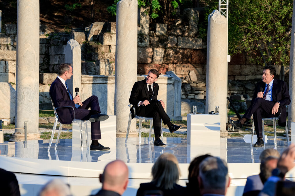 Συζήτηση του πρωθυπουργού Κυριάκου Μητσοτάκη με τον Πρόεδρο της Γαλλίας Emmanuel Macron, στο πλαίσιο εκδήλωσης που διοργάνωσε η εφημερίδα “Καθημερινή” με θέμα “Προκλήσεις για την Ευρώπη – Ο δρόμος προς το αύριο”, στην Ρωμαϊκή Αγορά Αθηνών, Παρασκευή 24 Απριλίου 2026. (ΓΙΩΡΓΟΣ ΚΟΝΤΑΡΙΝΗΣ/EUROKINISSI)