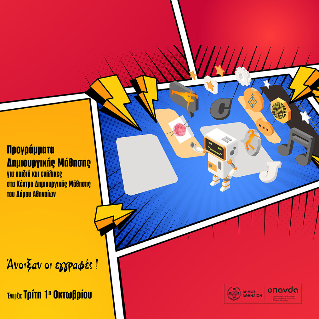 Ο Δήμος Αθηναίων εγκαινιάζει τη νέα περίοδο Προγραμμάτων Δημιουργικής Μάθησης από την Τρίτη, 1η Οκτωβρίου. Μέσα από τα δώδεκα Κέντρα Δημιουργικής Μάθησης του Οργανισμού Πολιτισμού, Αθλητισμού και Νεολαίας Δήμου Αθηναίων (ΟΠΑΝΔΑ), τα οποία βρίσκονται σε ισάριθμες γειτονιές της πόλης, προσφέρονται δραστηριότητες για όλες τις ηλικίες, σχεδιασμένες για να ανταποκρίνονται στις σύγχρονες ανάγκες των πολιτών και να ακολουθούν τις τάσεις της εποχής.