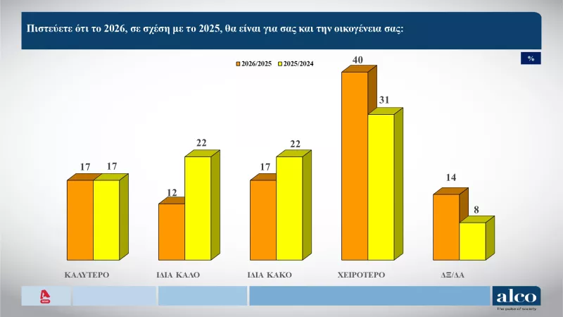 Το 57% των ερωτηθέντων πιστεύει ότι το 2026 θα είναι χειρότερο ή το ίδιο κακό (40% και 17% αντίστοιχα).