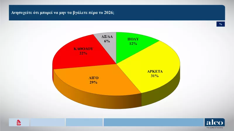Ιδιαίτερα απαισιόδοξες είναι οι προσδοκίες των πολιτών για το νέο έτος, σύμφωνα με το δεύτερο μέρος της δημοσκόπησης της ALCO για τον τηλεοπτικό σταθμό ALPHA. Η έρευνα καταγράφει ένα έντονο κλίμα ανασφάλειας, καθώς η πλειοψηφία των ερωτηθέντων εκτιμά ότι η προσωπική και οικογενειακή τους οικονομική κατάσταση είτε θα επιδεινωθεί είτε θα παραμείνει σε δυσμενές επίπεδο μέσα στο 2026.