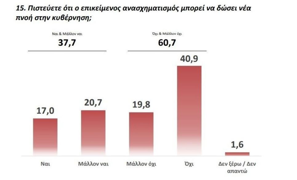 Ενώ ο ανασχηματισμός συζητείται εδώ και εβδομάδες, οι πολίτες δεν πιστεύουν ότι εάν γίνει θα έχει θετικό αντίκτυπο στην λειτουργία της κυβέρνησης. Το 60,7% των πολιτών απαντά αρνητικά στην ερώτηση εάν πιστεύουν ότι ο επικείμενος ανασχηματισμός μπορεί να δώσει νέα πνοή στην κυβέρνηση, ενώ μόλις το 37,7% των πολιτών απαντά θετικά.