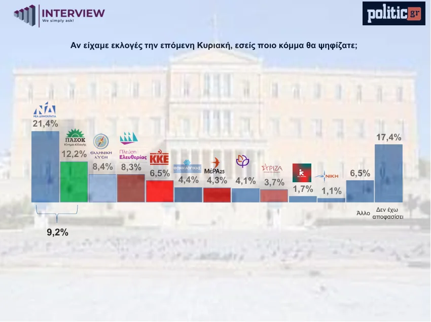 Η τελευταία δημοσκόπηση της Interview για το POLITIC, που πραγματοποιήθηκε αμέσως μετά την περίοδο (21–25 Αυγούστου), αποτυπώνει μία αξιοσημείωτη πτώση στα ποσοστά της Νέας Δημοκρατίας, ωστόσο δεν καταγράφεται αντίστοιχη δυναμική σε κανένα από τα υπόλοιπα κόμματα.