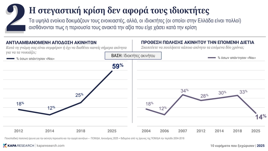 Η ακρίβεια παραμένει το κυρίαρχο πρόβλημα, με το 82% των νοικοκυριών να τη συνδέει κυρίως με τα τρόφιμα, ενώ ακολουθούν οι λογαριασμοί ηλεκτρικής ενέργειας και τα ενοίκια. Παράλληλα, το 59% θεωρεί συμφέρουσα την κατοχή ακινήτου για ενοικίαση, την ώρα που μόλις το 14% δηλώνει πρόθεση να πουλήσει ακίνητη περιουσία μέσα στην επόμενη διετία.
