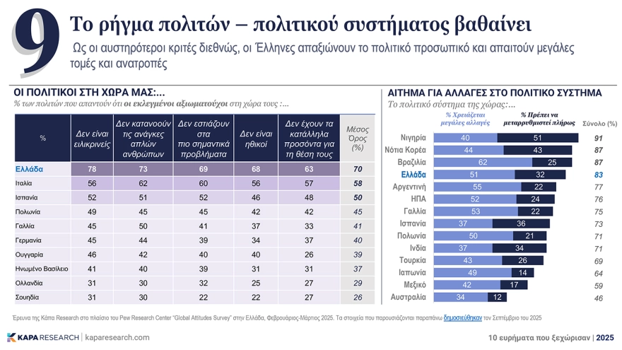 Στο πολιτικό πεδίο, ένας στους δύο πολίτες ζητά αλλαγές στο πολιτικό σύστημα, ενώ κυριαρχεί η αρνητική εικόνα για τους εκλεγμένους αξιωματούχους. Τέλος, στο ερώτημα για το τι πρέπει να αλλάξει στην Ελλάδα, το 52% τοποθετεί στην πρώτη θέση τη βελτίωση του βιοτικού επιπέδου, το 27% τη δικαιοσύνη και το 19% ζητά συνολική ανατροπή του συστήματος.