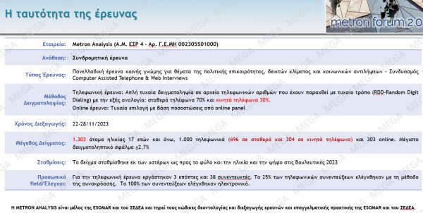 Δημοσκόπηση για τις πολιτικές εξελίξεις και τα κρίσιμα θέματα της επικαιρότητας που απασχολούν τους πολίτες, παρουσίασε απόψε το Mega σε συνεργασία με την Metron Analysis.