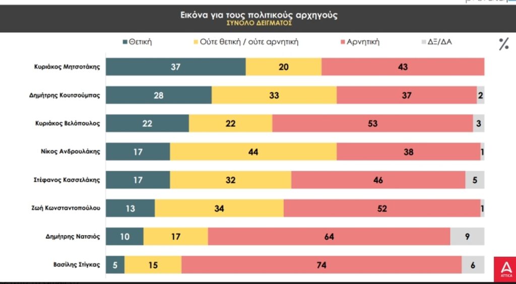 Όσο για την εικόνα που έχουν οι πολίτες για τους πολιτικούς αρχηγούς, θετική γνώμη για τον Κυριάκο Μητσοτάκη εκφράζει το 37% των ερωτηθέντων, δεύτερος έρχεται ο Δημήτρης Κουτσούμπας με 28%, ακολουθεί ο Κυριάκος Βελόπουλος με 22%, ενώ Στέφανος Κασσελάκης και Νίκος Ανδρουλάκης συγκεντρώνουν τις θετικές γνώμες του 17% και… μοιράζονται την τέταρτη θέση.
