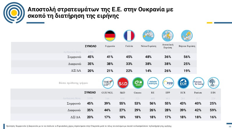 Στο ερώτημα του «polling in Europe» όπου οι συμμετέχοντες στην έρευνα καλούνται να απαντήσουν αν συμφωνούν ή διαφωνούν «με το να στείλουν οι ευρωπαϊκές χώρες στρατεύματα στην Ουκρανία μετά το τέλος του πολέμου με σκοπό να διασφαλίσουν τη διατήρηση της ειρήνης», το 45% των ερωτηθέντων δηλώνουν ότι συμφωνούν, ποσοστό 35% εκφράζει τη διαφωνία του και το 20% επιλέγει να μην εκφράσει άποψη (δεν ξέρω ή δεν απαντώ).