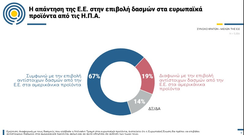 Δύο στους τρεις Ευρωπαίους -ή ποσοστό 67% των ερωτηθέντων- συμφωνούν με την επιβολή δασμών στα αμερικανικά προϊόντα αντίστοιχου ύψους με τις επιβαρύνσεις ύψους 20% που επέβαλε από σήμερα 9 Απριλίου 2025 ο Ντόναλντ Τραμπ σε όλα τα ευρωπαϊκά προϊόντα που εισάγονται στις ΗΠΑ.