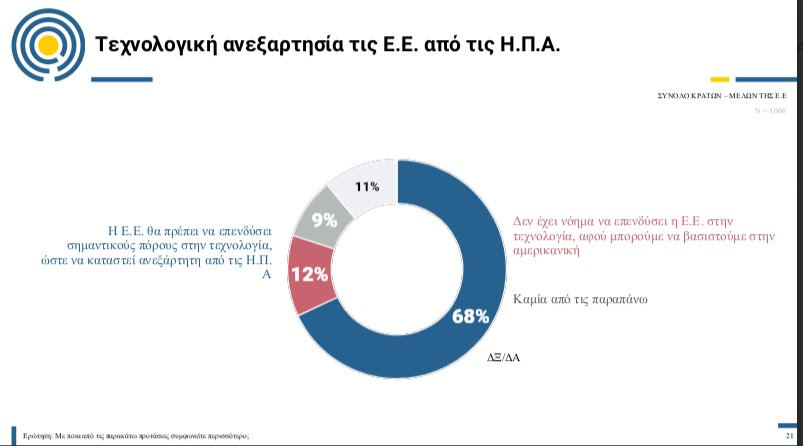 Σχεδόν 7 στους 10 πολίτες της Ευρωπαϊκής Ένωσης, με ένα συντριπτικό ποσοστό 68%, πιστεύουν ότι η ΕΕ θα πρέπει να επενδύσει σημαντικούς πόρους στην τεχνολογία ώστε να καταστεί ανεξάρτητη από τις ΗΠΑ.