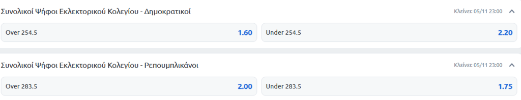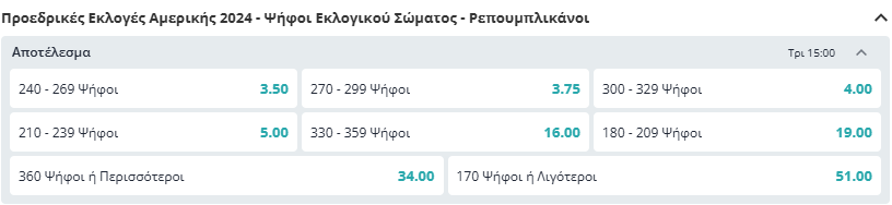 Όσον αφορά το εύρος των εκλεκτόρων, οι στοιχηματικές βλέπουν πιθανότερο εύρος 240-269 ψήφων για τους Ρεπουμπλικανούς και 270-299 για τους Δημοκρατικούς.