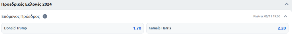 Αυτή τη στιγμή, ο Ντόναλντ Τραμπ παρουσιάζεται ως το φαβορί για την προεδρία. Σύμφωνα με τα δεδομένα από δύο μεγάλες στοιχηματικές εταιρείες, οι αποδόσεις για τον Τραμπ διαμορφώνονται περίπου στο 1.70, σε αντίθεση με την Κάμαλα Χάρις που έχει απόδοση 2.20. Οι τιμές αυτές δείχνουν ότι ο Τραμπ θεωρείται από τους περισσότερους παίκτες ως ο πιο πιθανός νικητής. Ωστόσο, παραμένει ανοιχτό το ενδεχόμενο να αλλάξουν οι συσχετισμοί όσο πλησιάζει η ημέρα των εκλογών, ιδιαίτερα αν προκύψουν νέες εξελίξεις ή ενδεχόμενα debates επηρεάσουν την κοινή γνώμη.