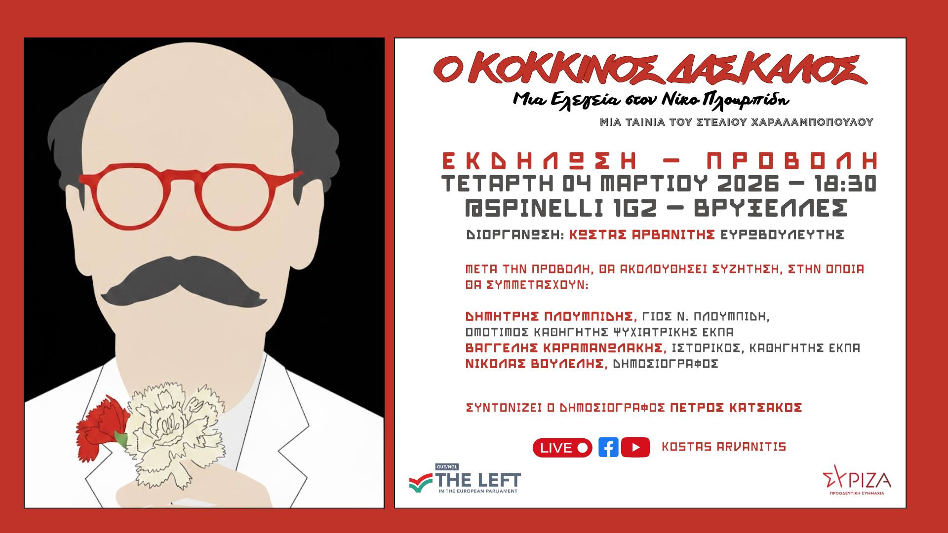 “Ο Κόκκινος Δάσκαλος”, το ιστορικό ντοκιμαντέρ του Στέλιου Χαραλαμπόπουλου για τη ζωή, την δράση και την εκτέλεση του Νίκου Πλουμπίδη, που σημάδεψε ανεξίτηλα την εποχή του, θα προβληθεί στην έδρα του θεσμού στις Βρυξέλλες την Τετάρτη, 4 Μαρτίου 2026.