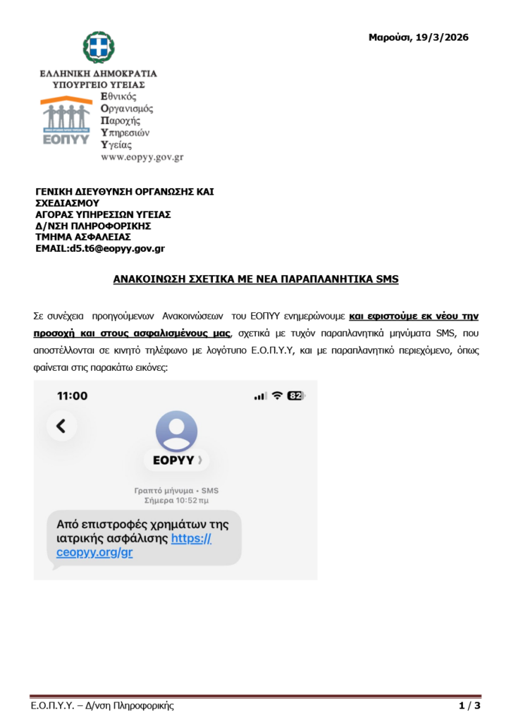 Ο EOΠΥΥ προχώρησε σήμερα το πρωί σε μια επείγουσα προειδοποίηση προς όλους τους ασφαλισμένους σχετικά με ένα νέο κύμα ψηφιακής απάτης. Οι επιτήδειοι αποστέλλουν μαζικά παραπλανητικά μηνύματα SMS στα κινητά τηλέφωνα εκατοντάδων πολιτών. Οι δράστες χρησιμοποιούν παράνομα το λογότυπο του οργανισμού για να προσδώσουν αληθοφάνεια σε αυτή την καλοστημένη παγίδα. Η διοίκηση του φορέα στην Αθήνα σήμανε άμεσα συναγερμό για την προστασία του κοινού από αυτή τη νέα απειλή. Τα μηνύματα αυτά εμφανίζονται συνήθως ως μια εξαιρετικά επείγουσα ειδοποίηση για κάποια υποτιθέμενη οικονομική εκκρεμότητα. Οι απατεώνες υπόσχονται στα θύματά τους την άμεση επιστροφή χρημάτων. Ο τελικός τους στόχος είναι να παγιδεύσουν τους ανυποψίαστους παραλήπτες σε κακόβουλες ιστοσελίδες. Αυτή η οργανωμένη επίθεση έχει ως μοναδικό σκοπό την υποκλοπή των τραπεζικών κωδικών και των ευαίσθητων προσωπικών δεδομένων.