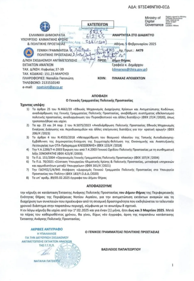 «Με απόφαση της Γενικής Γραμματείας Πολιτικής Προστασίας, ο δήμος Θήρας κηρύσσει κατάσταση έκτακτης ανάγκης, για την αντιμετώπιση των εκτάκτων αναγκών και την διαχείριση των συνεπειών που προέκυψαν από την σεισμική δραστηριότητα που εκδηλώνεται το τελευταίο διάστημα στην παραπάνω περιοχή. Η εν λόγω κήρυξη θα ισχύει από την 1η Φεβρουαρίου και θα διαρκέσει για έναν μήνα δηλαδή έως την 1η Μαρτίου».