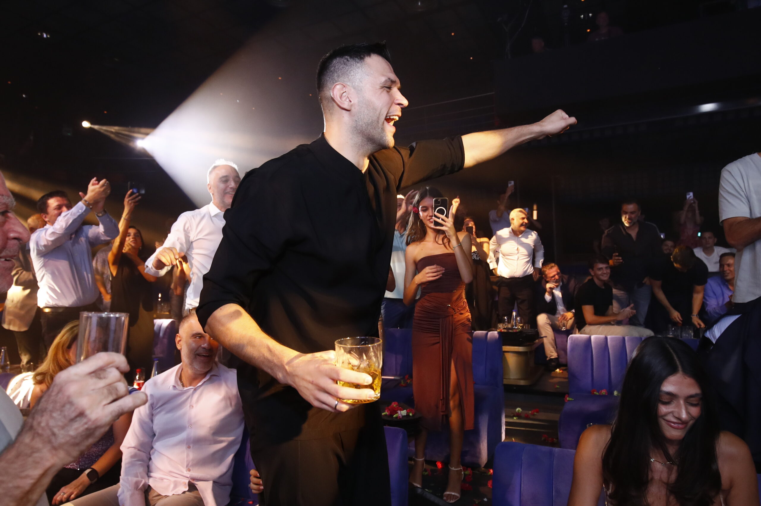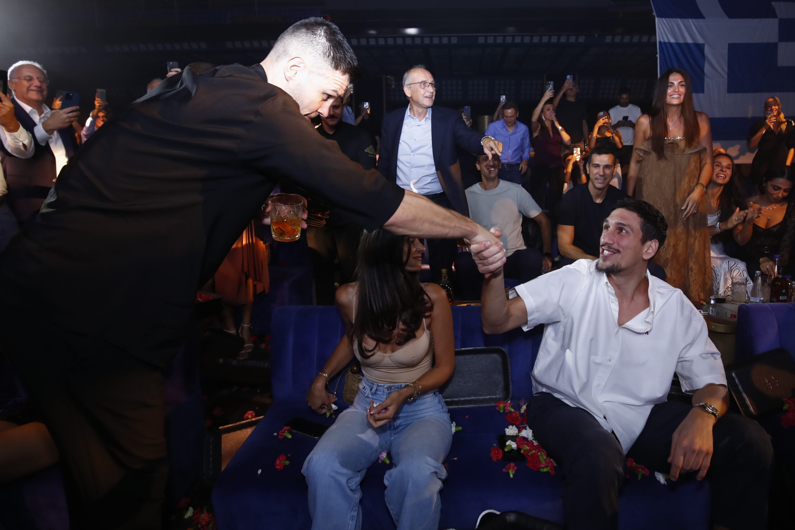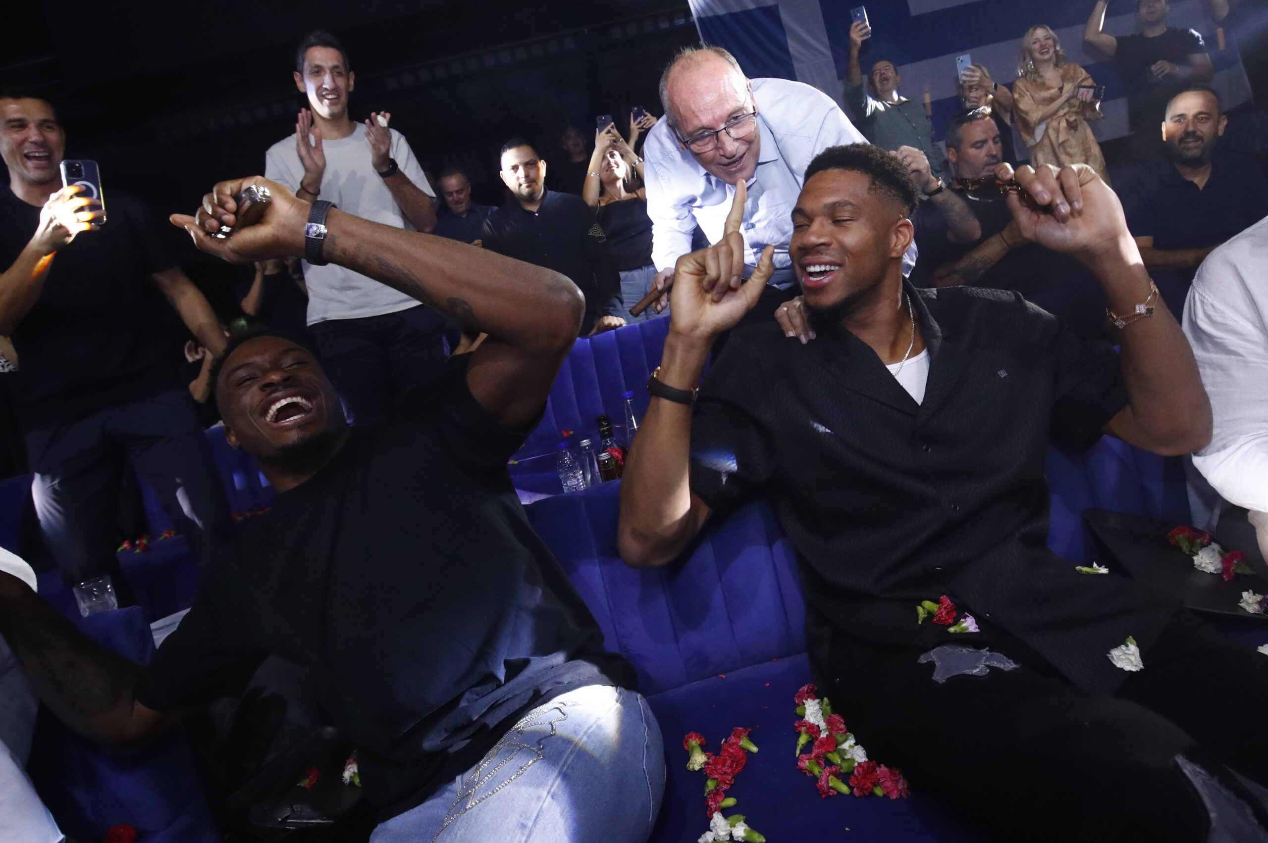 Γιάννης Αντετοκούνμπο, Βασίλης Σπανούλης, Βαγγέλης Λιόλιος, Γιαννούλης Λαρεντζάκης και ο Γενικός Διευθυντής της ΕΟΚ Ντίνος Σβερκούνος έσυραν τον χορό δίπλα στον τραγουδιστή Θοδωρή Φέρρη και το γλέντι … πήρε φωτιά!