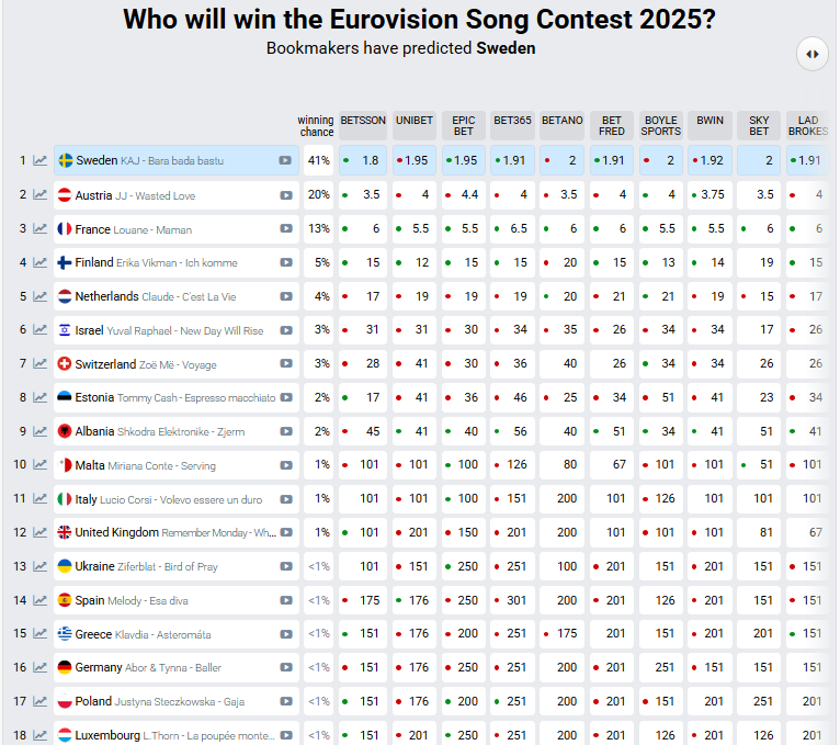 Όπως κάθε χρόνο, έτσι και φέτος, η Σουηδία κρατά τα ηνία στις προβλέψεις των μπουκμέικερς. Ακολουθούν – με μικρή διαφορά – Αυστρία και Γαλλία, ενώ η Ελλάδα μάς… εκπλήσσει αρνητικά, μη καταφέρνοντας να μπει ούτε στην πρώτη δεκάδα των στοιχημάτων.