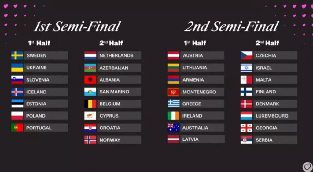 Οι χώρες στους δύο ημιτελικούς της Eurovision 2025 κατανέμονται ως εξής:
