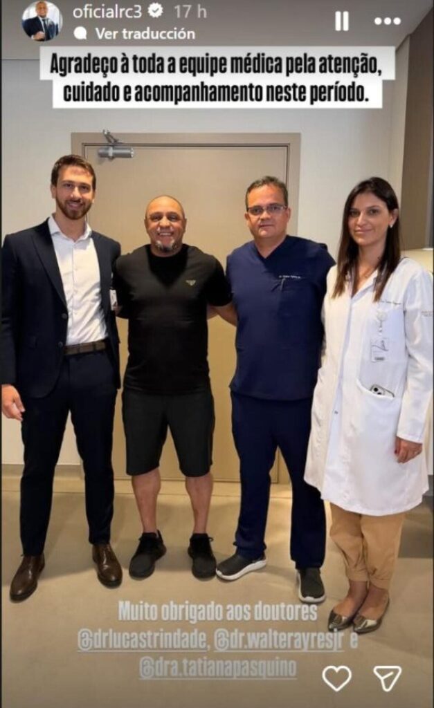 Ο Ρομπέρτο Κάρλος ευχαρίστησε την κλινική και ολόκληρη την ιατρική ομάδα που τον χειρούργησε μέσω μηνύματος στον λογαριασμό του στο Instagram, όπου απεικονίζεται με τους γιατρούς που πραγματοποίησαν την επέμβασή του.