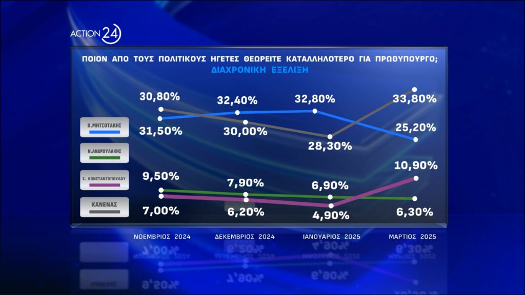 Στη διαχρονική εξέλιξη της καταλληλότητας για πρωθυπουργός, ο Κυριάκος Μητσοτάκης είχε 30,80% τον Νοέμβριο του 2024 και 25,20% τον Μάρτιο του 2025, ο Νίκος Ανδρουλάκης είχε 31,50% τον Νοέμβριο του 2024 και 6,30% τον Μάρτιο του 2025, η Ζωή Κωνσταντοπούλου είχε 9,50% τον Νοέμβριο του 2024 και 10,90% τον Μάρτιο του 2025, και το “Κανένας” είχε 32,80% τον Νοέμβριο του 2024 και 33,80% τον Μάρτιο του 2025.