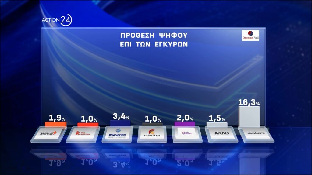 Στη δημοσκόπηση της OPINION POLL για λογαριασμό του ACTION 24 η δυναμική της Πλεύσης Ελευθερίας κατεγράφη ως εξής: