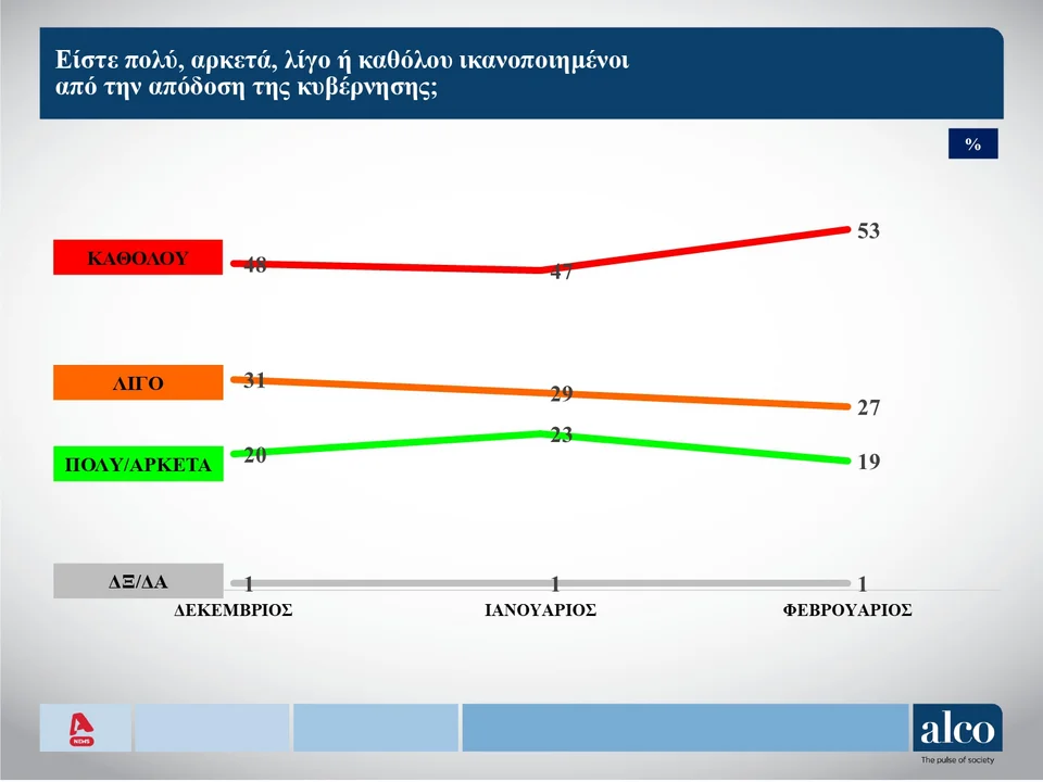 Σε ιστορικό υψηλό βρίσκεται η δυσαρέσκεια των πολιτών σε σχέση με τους κυβερνητικούς χειρισμούς. «Καθόλου ικανοποιημένοι» δηλώνουν οι πολίτες σε ποσοστό 53%. Λίγο ικανοποιημένοι, απαντά το 27%. ενώ πολύ και αρκετά ικανοποιημένοι, δηλώνουν οι ερωτηθέντες σε ποσοστό 19%.