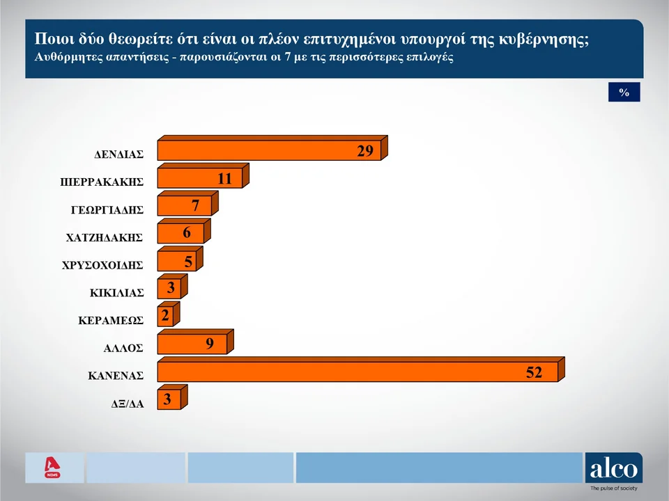 Διαχρονικά, ο υπουργός Εθνικής Άμυνας, Νίκος Δένδιας θεωρείται ο πιο επιτυχημένος υπουργός της κυβέρνησης με ποσοστό 29%. Σταθερά δεύτερος ο Κυριάκος Πιερρακάκης με 11%. Στη συνέχεια συναντούμε τους Άδωνι Γεωργιάδη (7%), Κωστή Χατζηδάκη (6%), Μιχάλη Χρυσοχοΐδη (5%), Βασίλη Κικίλια (3%) και η Νίκη Κεραμέως (2%). Τέλος, «Κανένας», απαντά το 52%.
