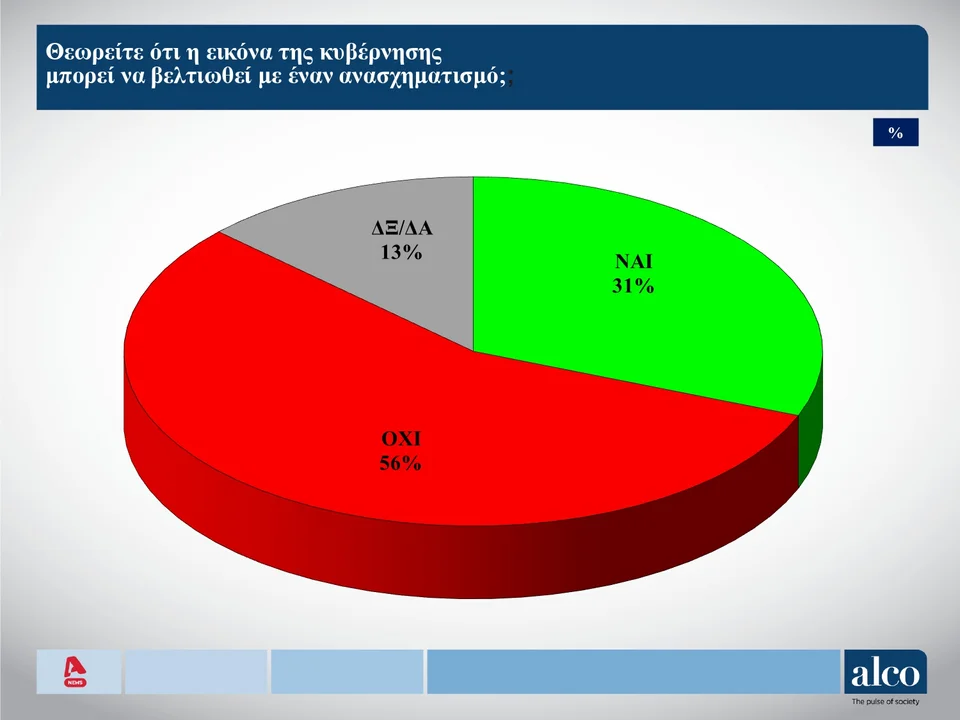 Όσον αφορά τον ανασχηματισμό ο οποίος αναμένεται να λάβει κάποια στιγμή χώρα, το 31% θεωρεί ότι θα μπορούσε να βελτιώσει την εικόνα της κυβέρνησης. Στον αντίποδα, το 56% πιστεύει πως η κυβερνητική εικόνα δεν βελτιώνεται.