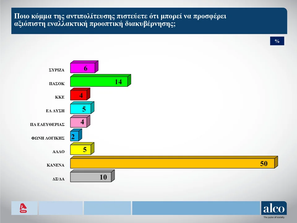 Στη δημοσκόπηση της ALCO έγινε και η ερώτηση, στο πλαίσιο μίας ενδεχόμενης πολιτικής αλλαγής, ποιο κόμμα της αντιπολίτευσης θα μπορούσε να προσφέρει αξιόπιστη εναλλακτική πρόταση διακυβέρνησης. Το ΠΑΣΟΚ συγκεντρώνει το 14%, ο ΣΥΡΙΖΑ το 6%, η Ελληνική Λύση το 5%, το ΚΚΕ 5%, η Πλεύση Ελευθερίας 5% και η Φωνή Λογικής το 2%. «Κανένα κόμμα» απαντά το συντριπτικό 50%.