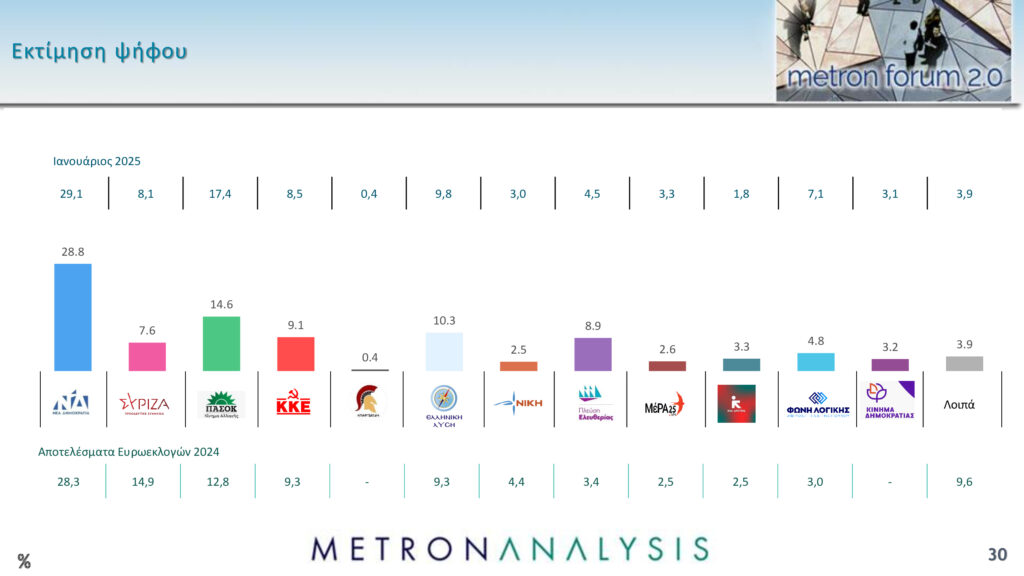 Στην πρόθεση ψήφου επί των εγκύρων, η Νέα Δημοκρατία καταλαμβάνει το 24,4%, ο ΣΥΡΙΖΑ το 7,3%, το ΠΑΣΟΚ το 13,3%, το ΚΚΕ το 7,7%, η Ελληνική Λύση το 7,6% και η Πλεύση Ελευθερίας το 5,6%.