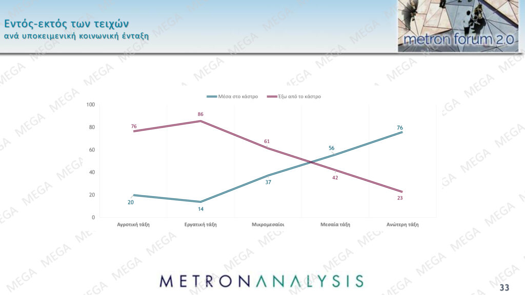Η δημοσκόπηση της Metron Analysis αποτυπώνει τα συναισθήματα των πολιτών σχετικά με την κοινωνική ασφάλεια και τη συμπερίληψη. Συγκεκριμένα, το 52% δηλώνει ότι αισθάνεται «εκτός του κάστρου», ενώ το 46% δηλώνει ότι βρίσκεται «εντός του κάστρου».