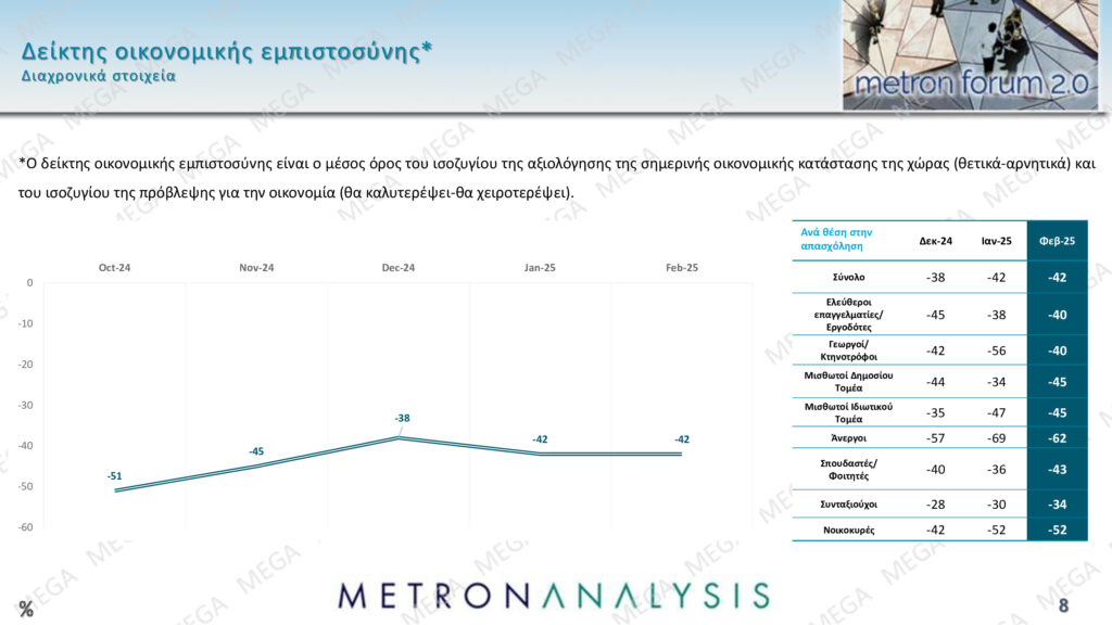 - Το ποσοστό όσων δηλώνουν χειρότερη θέση είχε πέσει στο 40% τον Ιανουάριο του 2025, αλλά ανέβηκε ξανά στο 45% τον Φεβρουάριο.
