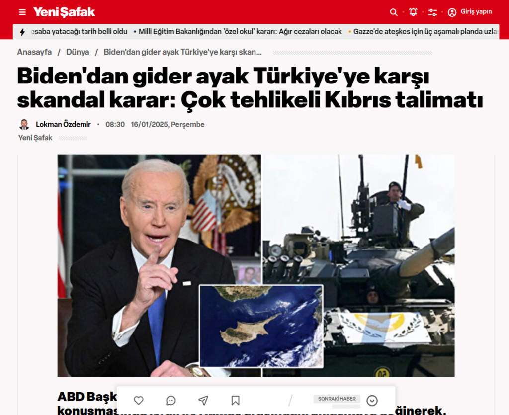 Ο αναλυτής της Yeni Safak Λοκμάν Οζντεμίρ, στο σημερινό του άρθρο χαρακτηρίζει «σκανδαλώδη» την απόφαση του Μπάιντεν και πολύ επικίνδυνη κίνηση για την Κύπρο».