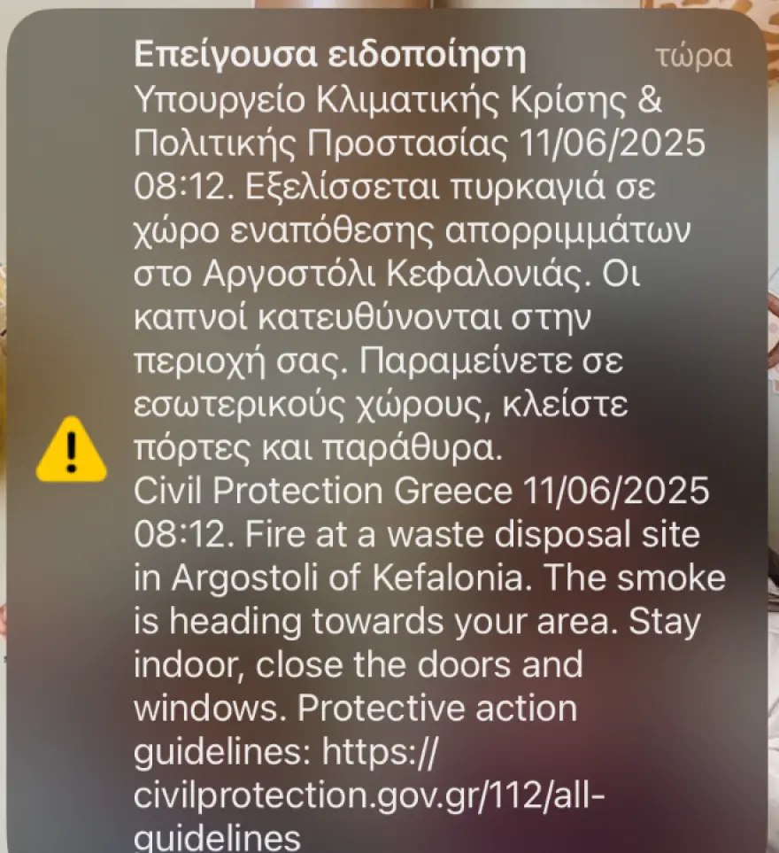 Παράλληλα εστάλη μήνυμα από το 112 για κίνδυνο από τους καπνούς, καλώντας σε παραμονή σε εσωτερικούς χώρους